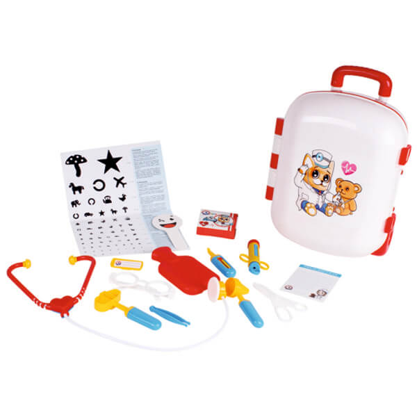 Βαλιτσάκι τρόλει με τα εργαλεία του γιατρού, στηθοσκόπιο, σύριγγα, ψαλίδι, σφυρί, ωτοσκόπιο, τσιμπιδάκι, θερμόμετρο, παγοκύστη,μπλοκ σημείωσεων, αυτοκόλλητα,γυαλιά και ταμπελάκι για το όνομα, τμχ 15